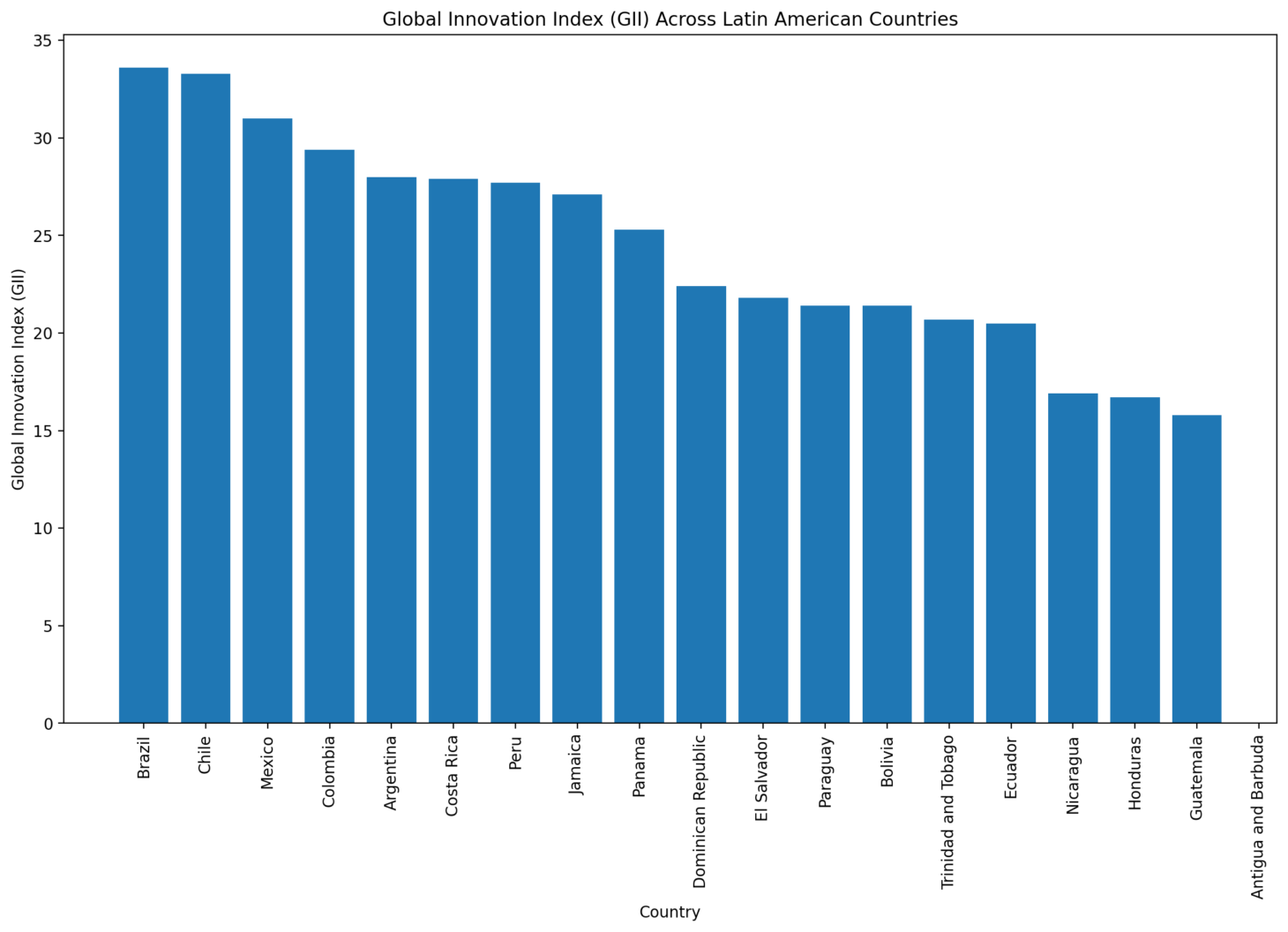In the third chart, countries are ranked based on their Global Innovation Index (GII) scores. Brazil and Chile lead, indicating a strong overall innovation ecosystem in these countries, which likely benefits agriculture among other sectors. The GII score reflects a wide array of factors, including technological and creative outputs, infrastructure, market sophistication, and the quality of higher education. Higher GII scores in some countries suggest they have a more conducive environment for innovation, which could translate into more advanced agricultural practices and productivity.