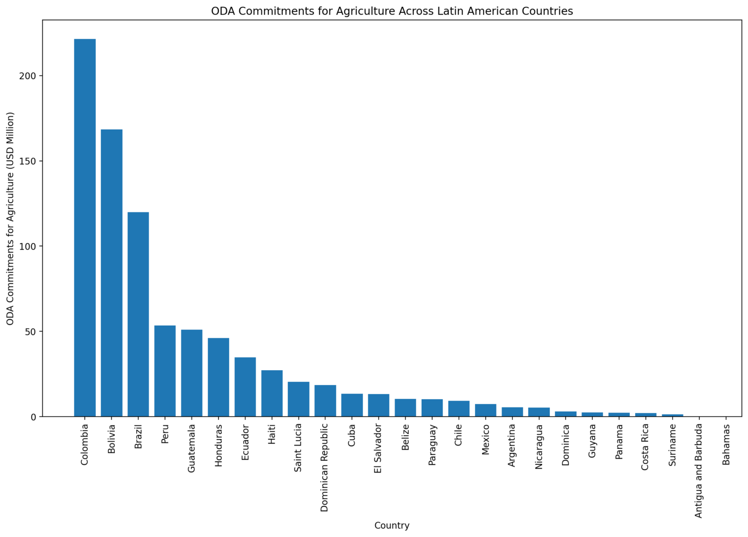 The second chart presents the official development assistance (ODA) commitments received by each country for agriculture. Colombia stands out as the highest recipient, followed by Bolivia and Brazil. This financial support is crucial for developing agricultural sectors, especially in funding research, infrastructure, and technology that could enhance productivity and sustainability. The disparities in ODA commitments might reflect differing needs, priorities set by donors, or the countries' ability to attract aid, which could significantly influence agricultural development and innovation.