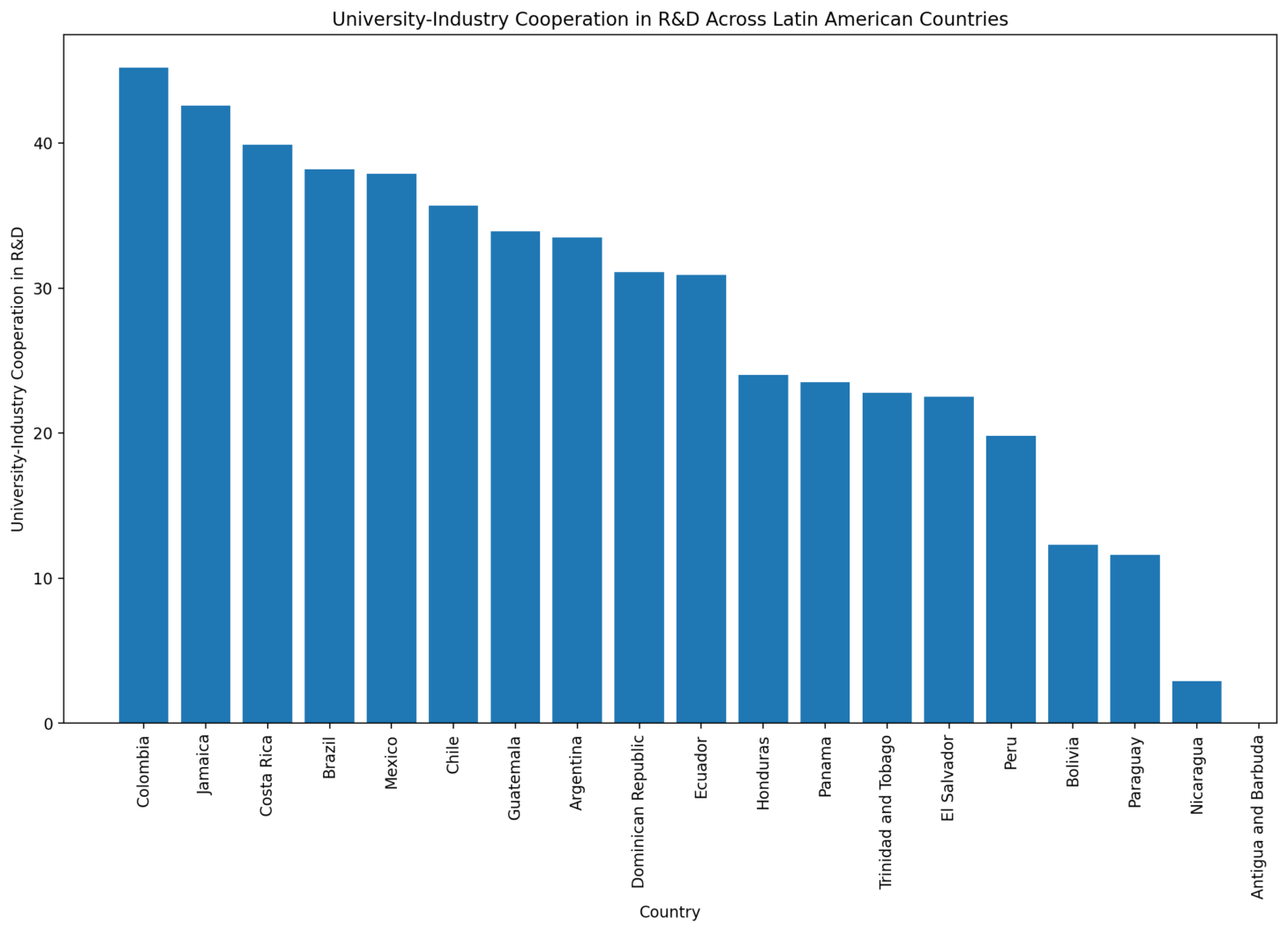 The first chart visualizes the level of university-industry cooperation in R&D across different Latin American countries. We observe a wide range of cooperation levels, with Colombia showcasing the highest level of cooperation. This suggests Colombia could have a more collaborative environment between universities and industries, potentially fostering innovation in agriculture. Conversely, countries with lower scores, such as Nicaragua, indicate less collaboration, which could impact their agricultural innovation capabilities. The varying levels of cooperation may influence how effectively these countries can innovate and apply new technologies or processes in agriculture.